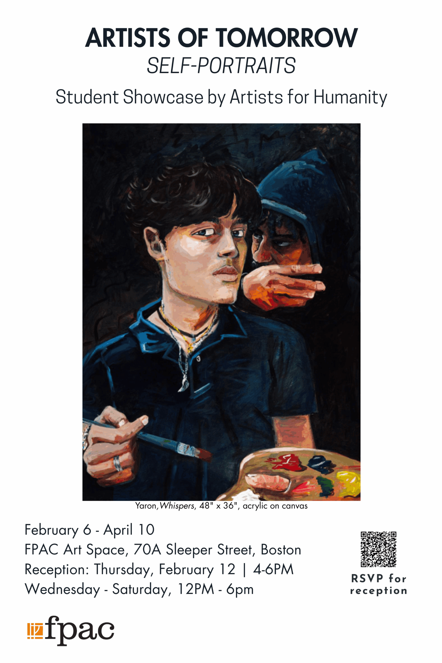 Founded in 1980, the Fort Point Arts Community (FPAC) is a nonprofit that supports and promotes a diverse community of artists in Fort Point and beyond. FPAC enriches Boston’s cultural life through exhibitions, open studios, art lending, and free performance events, managing two galleries: the FPAC Art Space (70 Sleeper Street) and the Gallery at Atlantic Wharf (290 Congress Street).