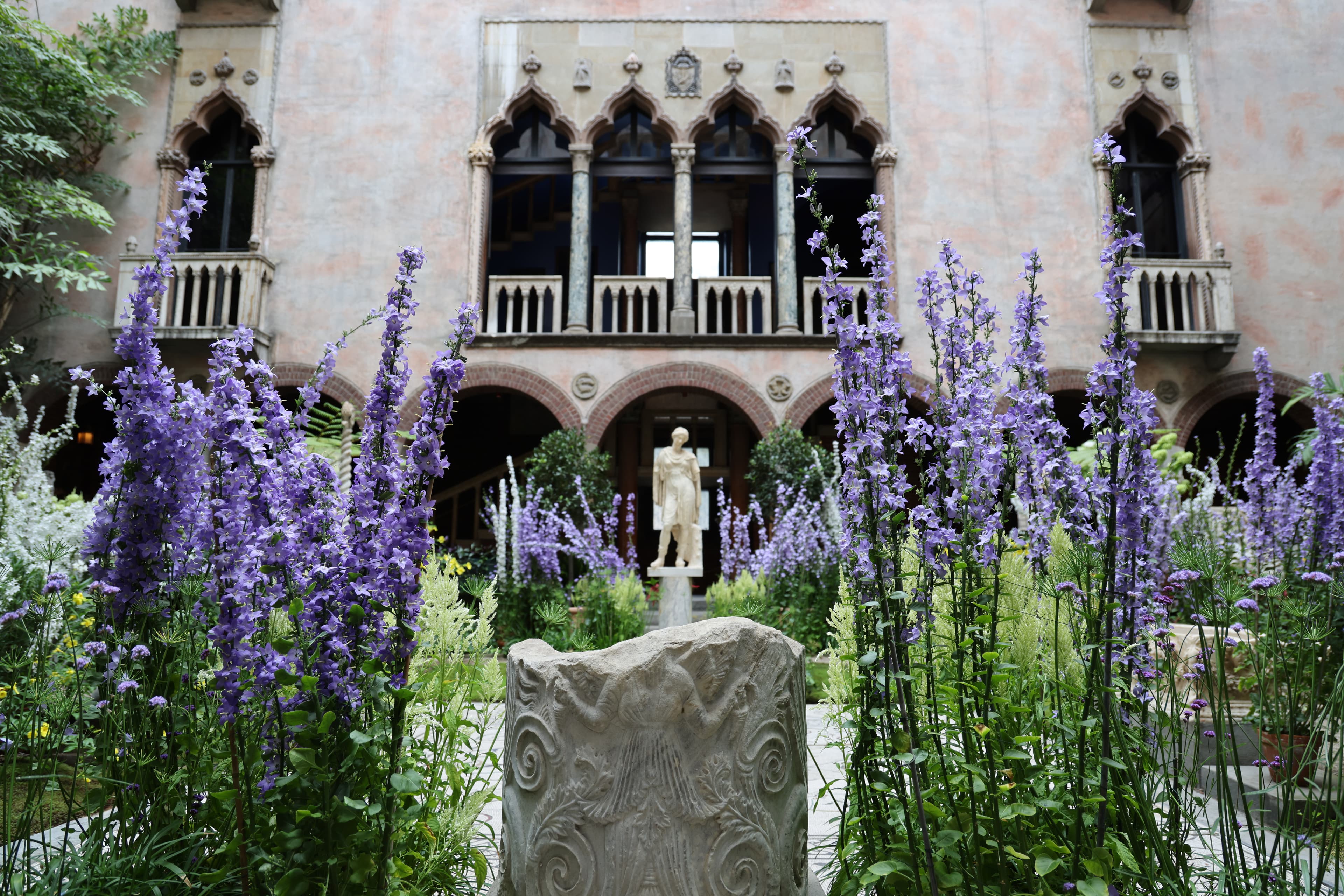 While the temperatures soar outside, the Courtyard remains cool with the green of ferns, and the sounds of water in the fountains. At this time of year, the chimney bellflower, Campanula pyramidalis, appears in the Courtyard; its tall flowering stalks are resplendent with starry blue and white flowers. The Museum’s horticulturists grow this plant as a biennial from seed; after two years, the plant grows to its six-foot maturity, resulting in a soft, Edenic escape within the Gardner. On view August through September, exact dates subject to change