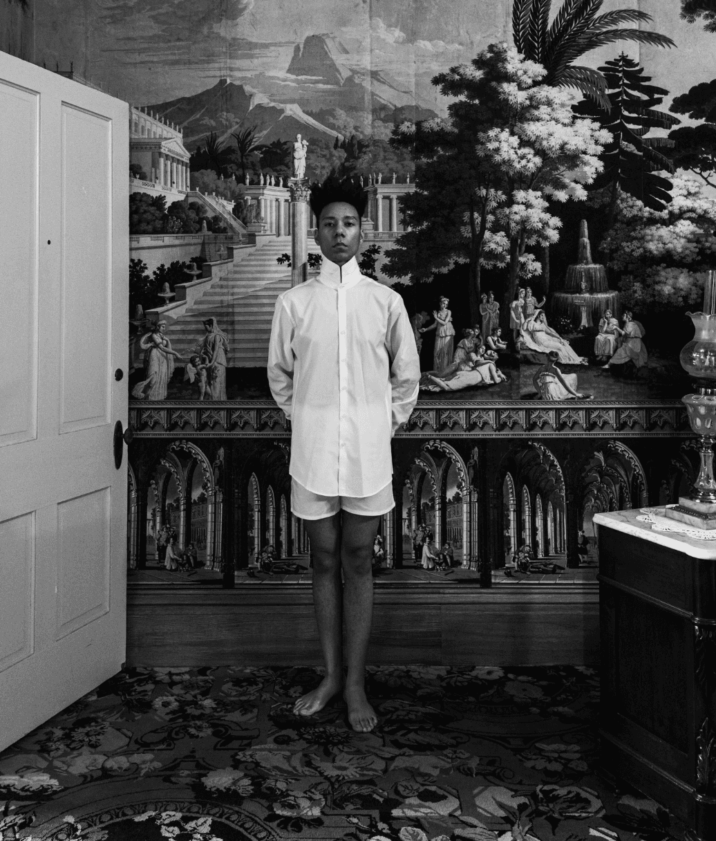 Central within this series is the starched white cotton dress shirt, a “potent symbol of power and masculinity, assimilation and oppression,” and a metaphor for how “the Black body was commodified alongside cotton.” The shirt appears throughout the photographs, worn by Smith and twice draped across their arm and lap. Smith pairs precise postures and hand gestures with alterations to the dress shirt, like an upturned collar, challenging the false dichotomy between masculine and feminine expression
