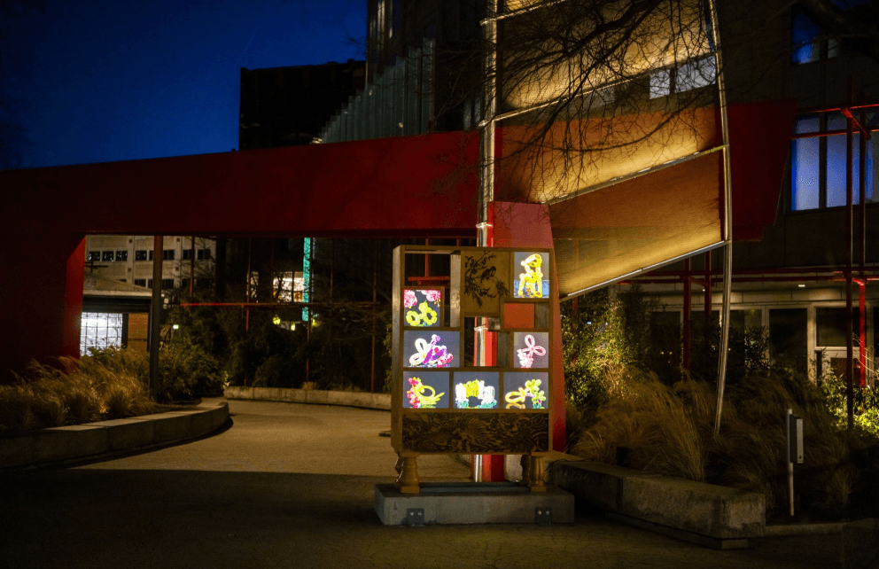 Far Away, From Home, an image-based sculpture, is part of Zhang’s ongoing inquiry into the complexities of home, immigration, identity politics, diaspora, and queerness in the public sphere. Responding to the Chinese zodiac Year of the Dragon in 2024, Zhang re-interprets a curio cabinet reminiscent of furniture from the artist’s childhood home in Hunan, China. The shelving unit is filled up with backlit photographs of “tattooed” latex balloons on one side, and their paper collage doppelgängers on the opposite side. It also features laser-etched panels highlighting scenes from Huaniaohua, a traditional type of Chinese Bird-and-Flower Painting, as well as etchings of the original tattoo imagery Zhang used on the latex balloons. The four supporting legs are modeled after balusters in porch railings and stairways that Zhang has encountered over the past year in Massachusetts.