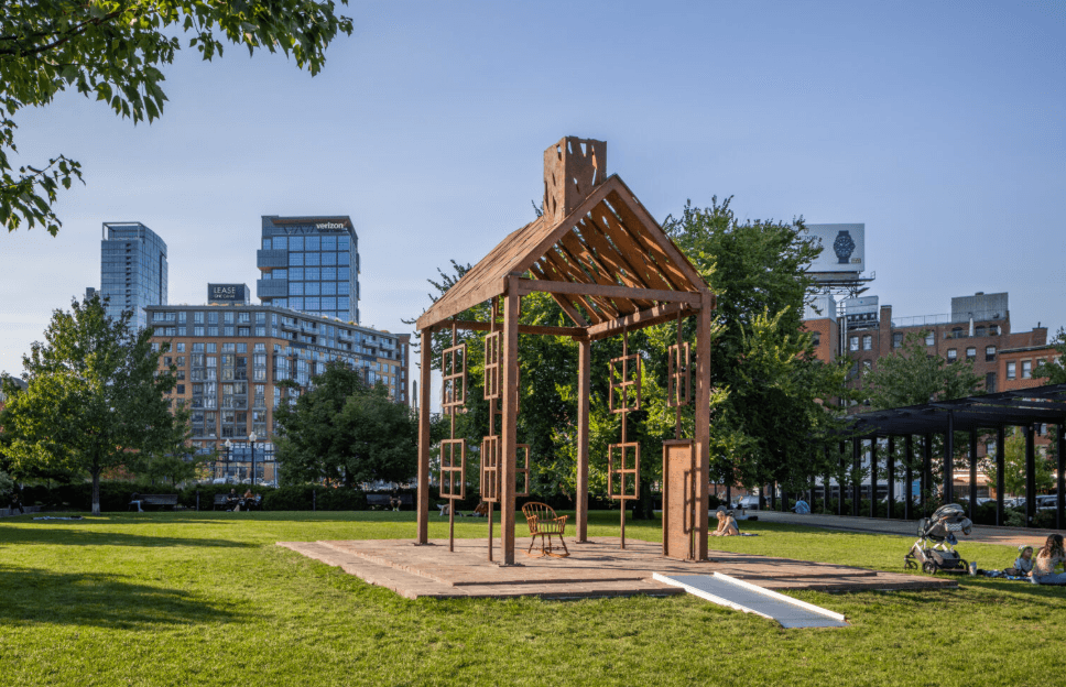 For the home’s roof awning, Rogers developed a unique “scarification” pattern which creates only partial shelter from the sun and rain, touching upon the current-day precarity of homeownership for Black and Brown communities in Boston and across the US. It also references the scar-like form and history of The Greenway itself, a park built over and upon the painful displacement of communities of color during the initial highway construction project.