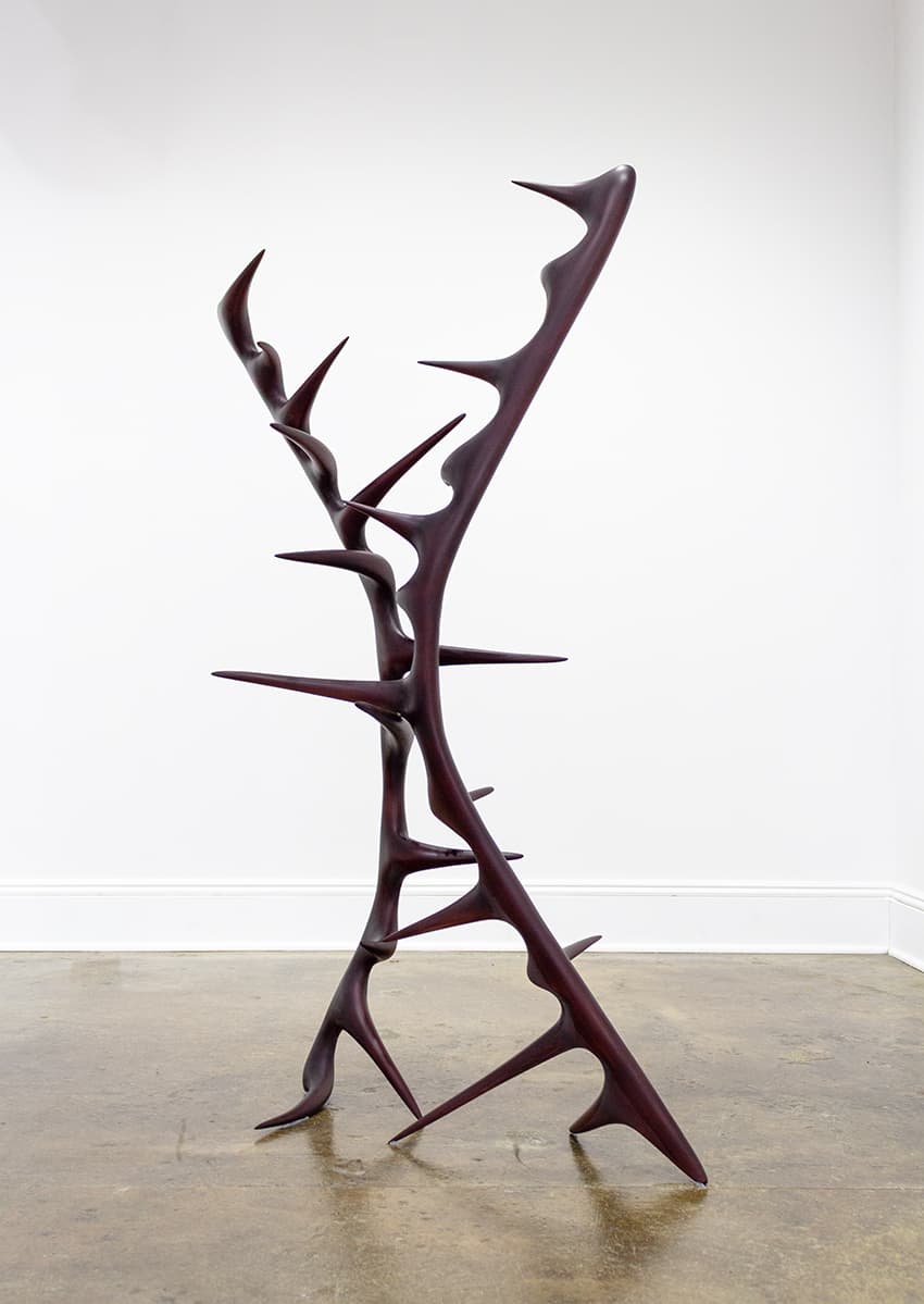 In Hauntology, Jared Abner pays tribute to the history and memories of the artists that have influenced contemporary sculpture. The organic standing shapes of articulated wood forms maintain their equilibrium as they swirl in space. Abner has developed a craftsmanlike devotion to wood but does not lose sight of the importance of play. The materials do what they do, and Abner does his thing. Abner gets lost in the materials, finding meaning, and making art.