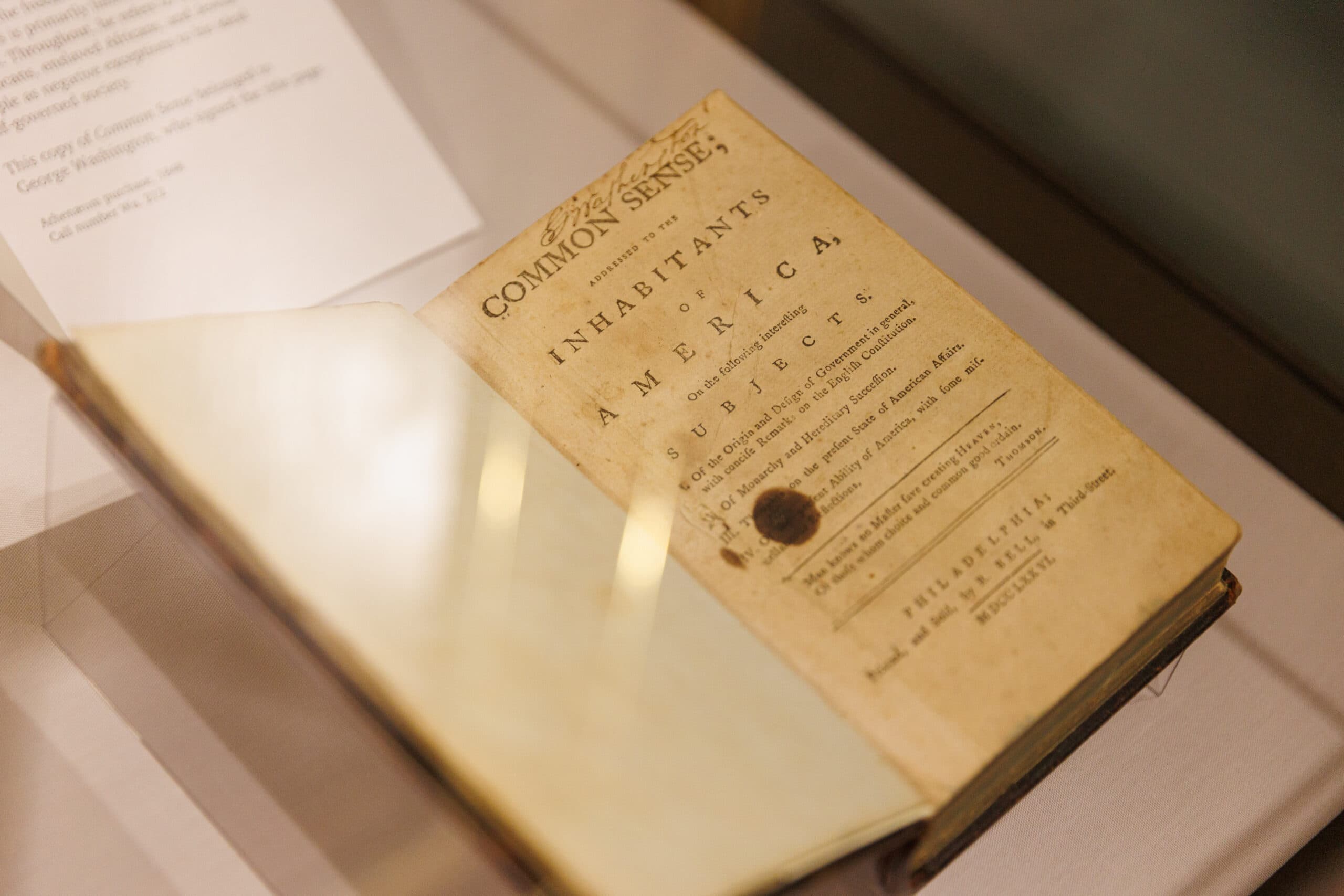On the Athenaeum's first floor, visitors will encounter rare and perhaps unexpected materials drawn from George Washington’s own library—including his personal copy of Thomas Paine’s Common Sense. Alongside Washington’s books on agriculture and military strategy are pamphlets that reveal the era’s contested ideas about slavery, Indigenous diplomacy, and early American politics, offering a complex portrait of the nation at its beginnings.