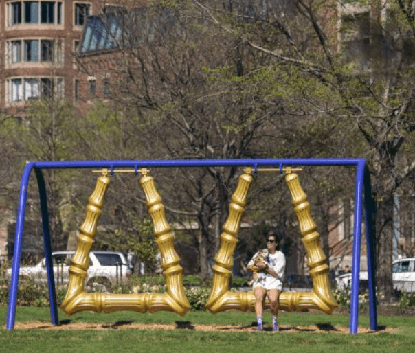 Big Hoops to Fill is a large-scale sculpture designed by Boston-based artist, sculptor, and jewelry maker Ja’Hari Ortega (she/her). The artwork features two outsized golden bamboo hoop earrings –also known as “door knocker earrings” – that function as interactive swings. Cast from fiberglass with steel interior supports, the earrings hang from a swing set frame that echoes the one the artist grew up playing on in Roxbury, MA.