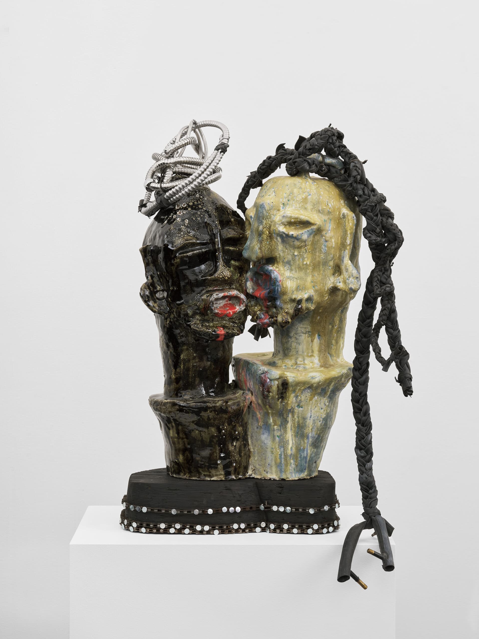 The evocative, adorned sculptures of Leilah Babirye (b. 1985 in Kampala, Uganda) feature the artist’s inventive reuse of debris with her deft carving of wood and work with ceramics. She uses the metal gears and chains of bicycles to create elaborate headdresses and jewelry, and the rubber inner tubes of bicycle tires to form long tresses that mingle with the burnt-black angles of her carved sculptures and the colorful glazes of her bulbous ceramic forms. For the ICA, Babirye premieres a new body of ceramic sculptures inspired by the idea of the queer wedding. Each sculpture adopts a role—bride, groom, ring bearer, flower girl, bridesmaid, or groomsman—in a vivid installation that is both wedding ceremony and celebration. Witnessing this central event are a number of large-scale works in charred wood, representing the aunties, uncles, and ancestors who have populated the artist’s practice from the beginning. For Babirye, who fled Uganda after being outed as gay, the exhibition continues her commitment to uplift LGBTQ identities through her singular, striking sculptural practice. The exhibition will be accompanied by the artist’s first book.