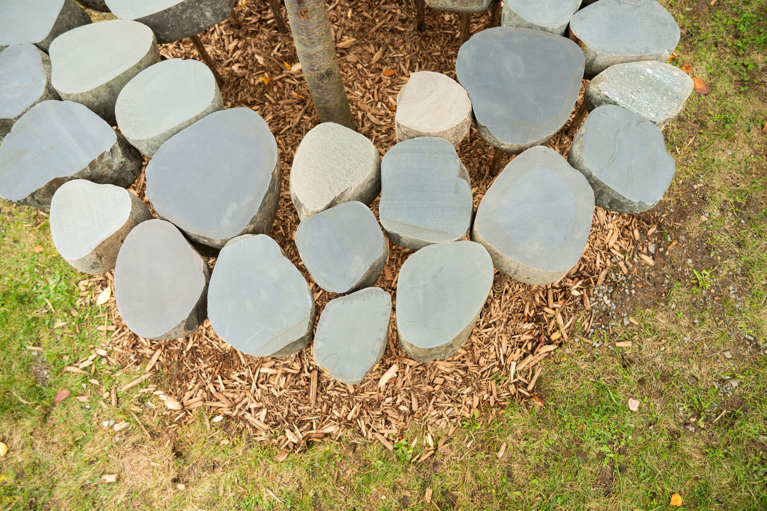 Stone Circle Bench is an extension of Ekene Ijeoma's ongoing living monument and archive, Black Forest. Working with communities and local organizations, Ijeoma's project honors the deceased by planting trees to recognize Black lives lost across Boston. Tree plantings bring communities together in remembrance while providing the long-term environmental benefit of tree coverage—lowering temperatures and enhancing health and well-being. The bench and trees address the disproportionate mortality rates faced by Black communities, which are exacerbated by environmental disparities due to, among other factors, reduced tree coverage in redlined neighborhoods.