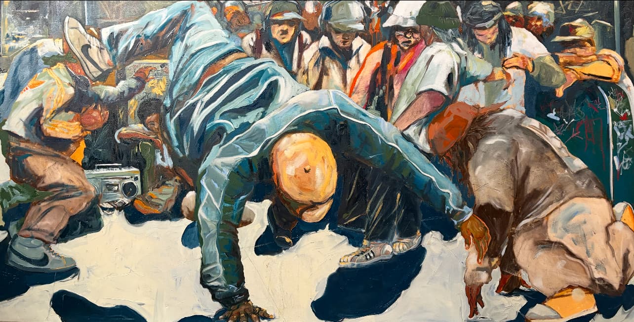 “This assortment of paintings and drawings focus on the body as a vessel for narrative, emotion, and connection, using movement to investigate themes of identity, vulnerability, or shared humanity, drawing from personal experience and diverse techniques (breakdancing to modern, ballet) to create imagery that resonates with audiences by revealing universal truths through specific, embodied stories and the interplay between individual dancers and collective experience. “