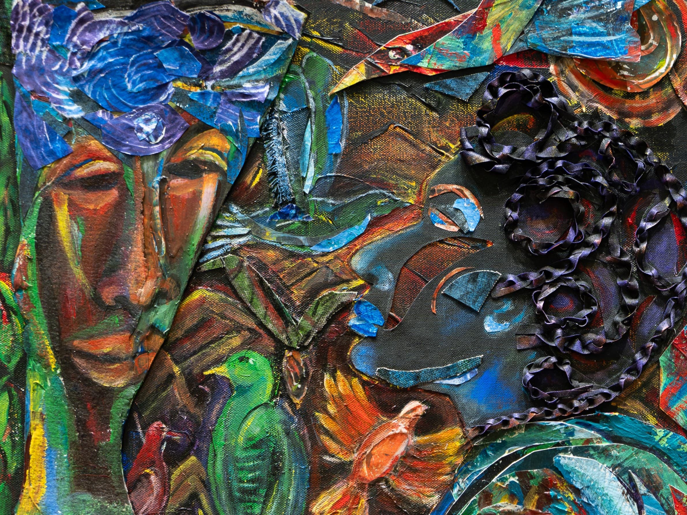We Are Here To Thrive! begins with a profound acknowledgment of our shared origins. In Earth Guardian and Land Guardian, Tinker presents ancestral figures—both male and female—who nurtured and sustained the natural environment, ensuring our survival through their care and wisdom. These works remind us that the stewardship of our planet has always been a collective responsibility. From this foundation, the exhibition expands to explore the sacred role women have played throughout history in maintaining balance and protecting what heals the soul of our earth. In Case The Secret Listens reveals the often-invisible labor of women whose work sustains communities and preserves vital knowledge across generations.